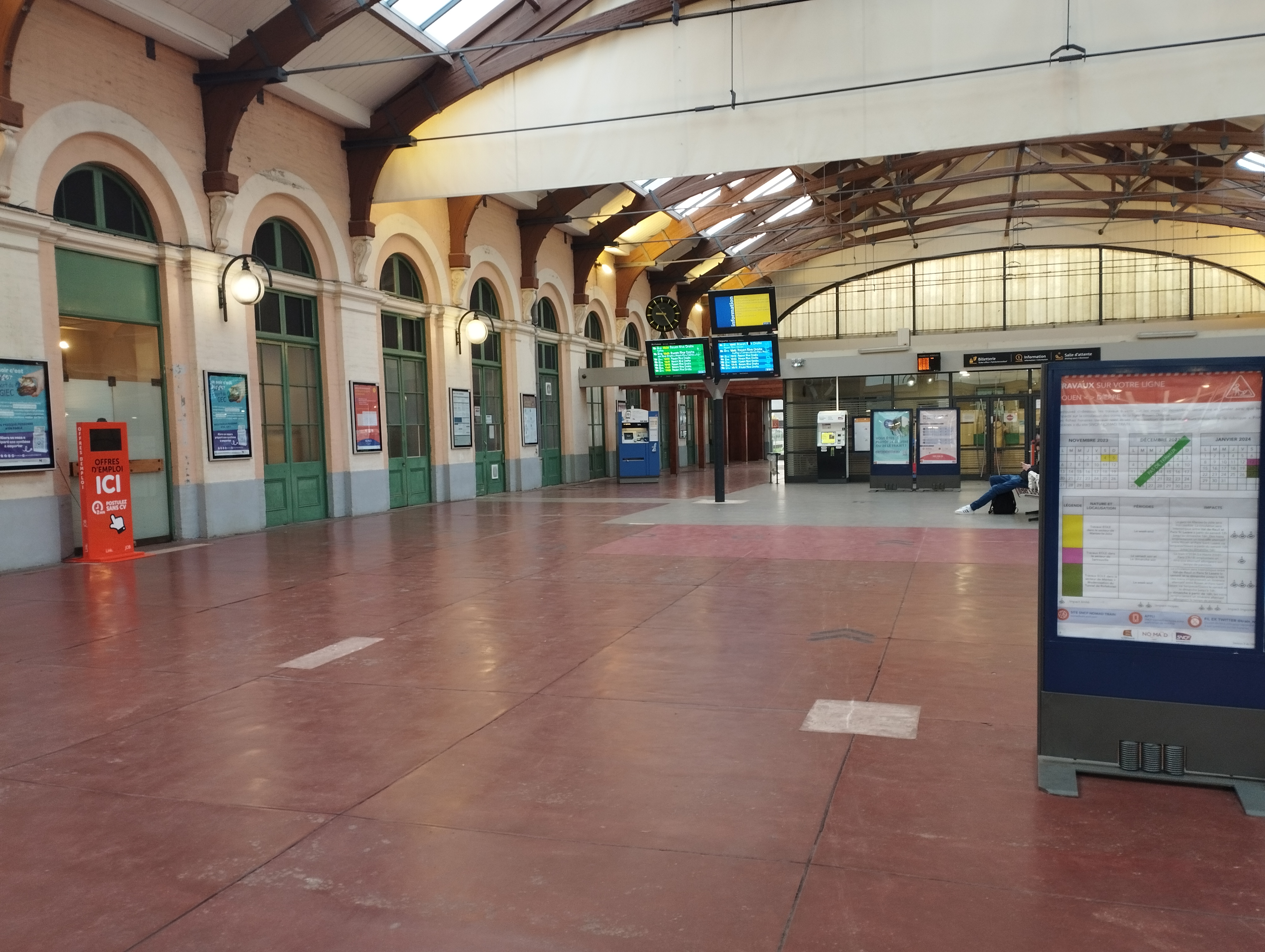 Vieille gare sale de l'extérieur mais bien à l'intérieur. Malheureusement, la collection habituelle de racailles du SDF et de leurs chiens fréquente l'intérieur. Tard dans la nuit - Non recommandé aux voyageurs seuls ou aux femmes. Petite boutique pour acheter des trucs. Quais et départs/arrivées très simples et rapides. Le personnel du train vers Rouen était toujours sympathique et serviable – ce qui n'est pas l'attitude habituelle de la SNCF. Des trains propres et modernes.