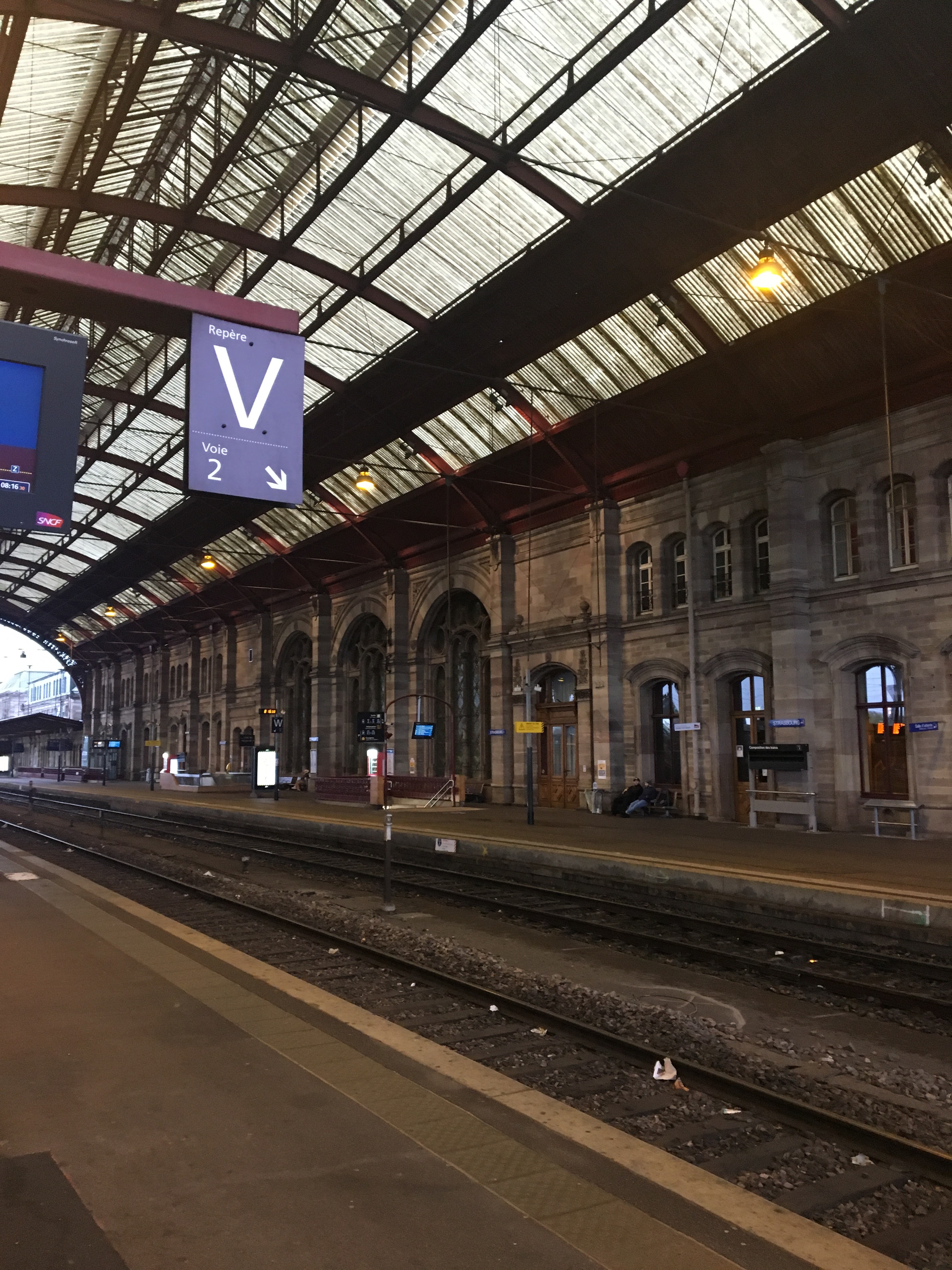 Quelle belle gare que celle de Strasbourg, Construite en grès rouge comme tant de bâtiments dans la région, une grande verrière moderne y a été adossée et le mariage est plutôt réussi. Ajoutez à cela, de beaux vitraux, et des services bien distribués, et vous avez une gare bien sympathique.